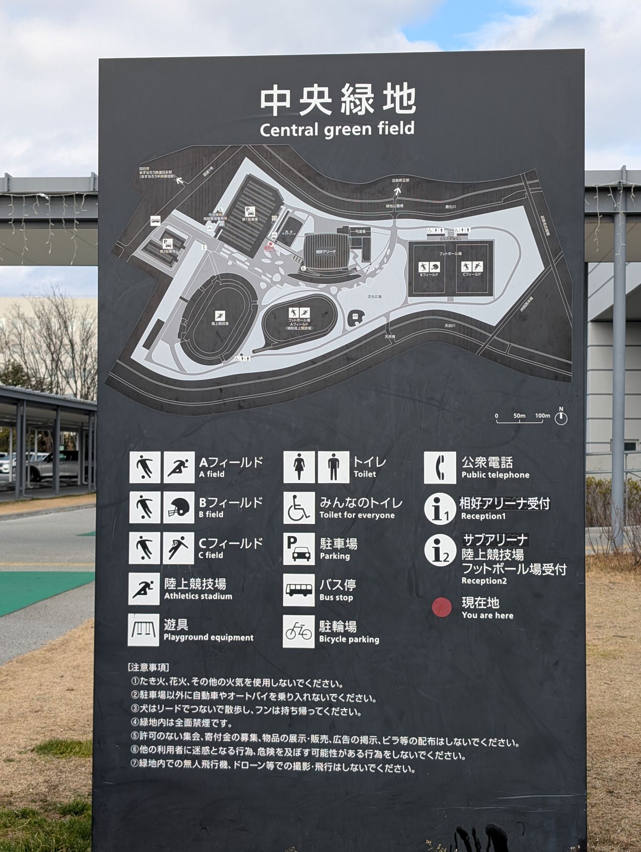 四日市中央緑地公園は総合体育館、陸上競技場、フットボール場などのスポーツ施設を備えた大型緑地公園です。